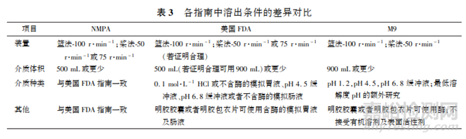 各指南對溶出測定條件的規(guī)定差異對比見表3。