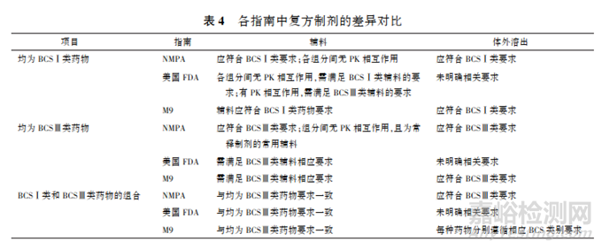 對于復方制劑, 美國FDA指南僅對輔料進行了要求, 對于體外溶出未明確相應(yīng)的要求,對于均為BCSⅠ類藥物需考慮組分間是否有PK影響。M9并未考慮組分間的PK影響,而是從輔料及體外溶出2個方面對復方制劑分別進行了要求, 見表4。