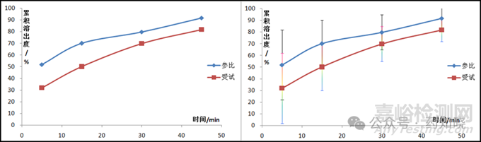 因?yàn)?.4項(xiàng)下的判定以置信區(qū)間的上限與參比制劑的相似限度進(jìn)行比較,所以,需要使上限盡可能的小,才有可能判定相似。如何讓上限盡可能的小呢?正如2.2項(xiàng)下表述,應(yīng)該使參比制劑和受試制劑的溶出曲線各時(shí)間點(diǎn)的距離差值最小、參比制劑或受試制劑各時(shí)間點(diǎn)溶出的RSD最大。MSD本質(zhì)上就是距離,各時(shí)間點(diǎn)的距離差值越小,兩條溶出曲線越接近,MSD越小,這一點(diǎn)比較好理解。如何理解需要參比制劑或受試制劑各時(shí)間點(diǎn)的RSD大呢?可以參考下圖, 假如參比和受試樣品的溶出曲線RSD可以忽略(左圖),那么兩條溶出曲線的距離就是我們實(shí)際觀察到的距離。假如參比和受試樣品的溶出曲線RSD非常大(右圖),平均溶出量不變,考慮到RSD波動(dòng)后,受試樣品和參比制劑可能互相包含,你中有我,我中有你,自然兩者的MSD會(huì)變小。