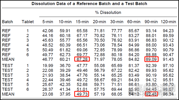 根據(jù)FDA公布的參考文獻(xiàn)(Statistical Assessment of Mean Differences Between Two Dissolution Data Sets),給出了一批參比制劑和一批仿制藥的溶出數(shù)據(jù),見表1。