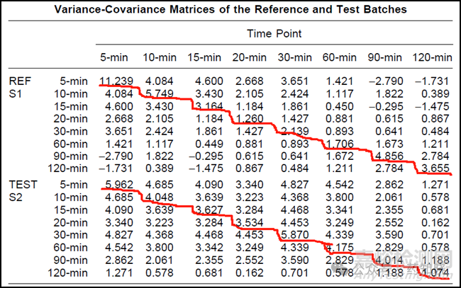 表3參比制劑和仿制藥合并后的協(xié)方差矩陣
