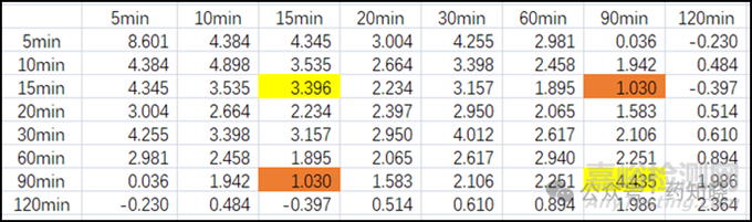 據(jù)協(xié)方差矩陣表3,可知15min和90min的協(xié)方差矩陣由σ11=3.396,σ12=1.030,σ21=1.030,σ22=4.435構(gòu)成。Σ矩陣和∑-1矩陣見下圖。