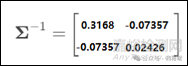 首先將馬氏距離公式分成三個(gè)部分,(x-μ)T、∑-1和(x-μ),其中(x-μ)T是(x-μ)的行列變換,行變成列,列變成行,見下圖。其實(shí)都是同一個(gè)數(shù)組,即15min和90min參比的平均溶出量減去仿制藥的平均溶出量,記作(-17.54,3.39)。