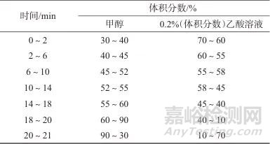 色譜柱:ACQUITY UPLC HSS T3柱(100 mm×2.1 mm,1.8 μm,美國(guó)沃特世公司);流動(dòng)相:A相為甲醇, B相為0.2%(體積分?jǐn)?shù))乙酸溶液,流量為0.4 mL/min;柱溫:40 ℃;進(jìn)樣體積:2 μL。洗脫方式:梯度洗脫,洗脫程序見表1。