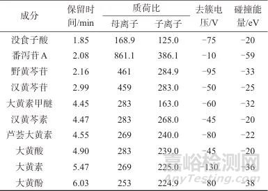 采用針泵進(jìn)樣方式,以7.5 μL/min的流量向質(zhì)譜儀中注入200 ng/mL的單一對(duì)照品溶液,對(duì)每個(gè)目標(biāo)活性成分進(jìn)行質(zhì)譜參數(shù)優(yōu)化,包括去簇電壓和碰撞能量,根據(jù)質(zhì)譜響應(yīng)確定定量離子對(duì),各活性成分在負(fù)離子模式下,有較高的質(zhì)譜響應(yīng)值,因此選擇負(fù)離子模式進(jìn)行定量分析。優(yōu)化后的多反應(yīng)監(jiān)測(cè)質(zhì)譜參數(shù)見表2。