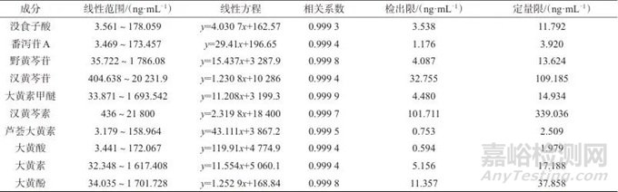 表 3 10種中藥活性成分的的線性范圍、線性方程、相關(guān)系數(shù)、檢出限和定量限