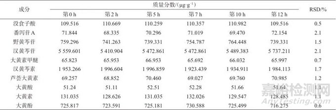 取1.3.3處理的喘舒片樣品溶液1份,分別在樣品溶液制備后第0、2、5、7、10、12、24 h在1.2儀器工作條件下進(jìn)樣測(cè)定,穩(wěn)定性試驗(yàn)結(jié)果見表4.由表4可知,測(cè)定結(jié)果的相對(duì)標(biāo)準(zhǔn)偏差(RSD)為0.5%~2.1%,該方法穩(wěn)定性良好。