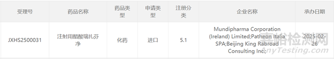 2025年2月26日,萌蒂制藥(Mundipharma)注射用醋酸瑞扎芬凈的新藥申請(qǐng)上市已獲得中國CDE受理。2023年3月該藥物已在美國通過FDA批準(zhǔn),同年12月,獲得歐洲EMA批準(zhǔn)。