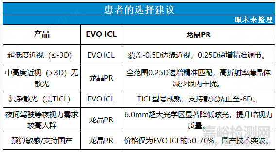 EVO ICL仍具備不可替代性,對(duì)低度近視和復(fù)雜散光矯正(TICL)仍為國(guó)際金標(biāo)準(zhǔn)。龍晶®PR的突破在于全范圍0.25D遞增填補(bǔ)了超高度近視精準(zhǔn)矯正的空白,0.25D遞增能更貼近實(shí)際屈光度,減少術(shù)后殘余度數(shù)(如-9.25D患者無(wú)需被迫選擇-9.0D或-9.5D),尤其適合對(duì)視力要求苛刻的職業(yè),同時(shí)在晶體大小適配方面,整體的型號(hào)規(guī)劃更豐富、適合追求“無(wú)妥協(xié)”視力質(zhì)量的患者。