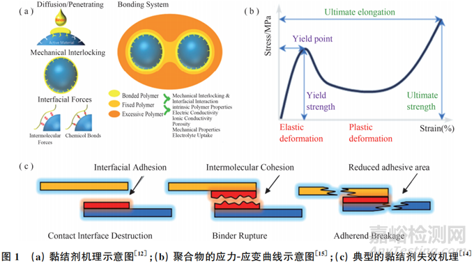 黏結(jié)劑結(jié)構(gòu)破壞或者失效會(huì)導(dǎo)致離子、電子的路徑破壞和活性物質(zhì)的損失,從而導(dǎo)致電池容量衰減和安全隱患。破壞機(jī)制通??梢詺w結(jié)為3個(gè)原因(圖1(c)):(1)接觸界面破壞:黏結(jié)劑黏結(jié)力不足,黏結(jié)劑不能與被黏物有效結(jié)合,從而導(dǎo)致電極脫落。(2)黏結(jié)劑破裂:黏結(jié)劑在電池循環(huán)過程中會(huì)受到應(yīng)變和應(yīng)力變化的影響如圖1(b)所示,