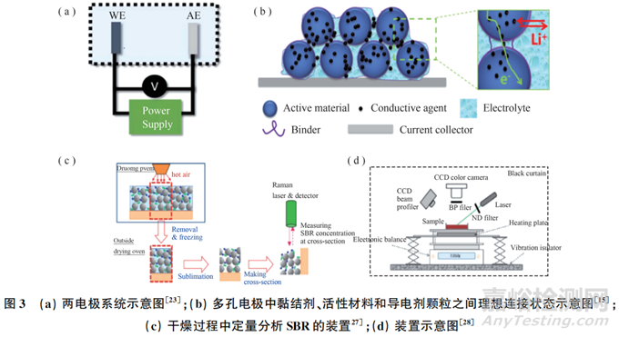 如圖3(c)所示,Hagiwara等通過一種集分析天平和表面溫度測(cè)量于一體的干燥裝置制備樣品,捕獲干燥中間階段的涂層結(jié)構(gòu)。采用拉曼光譜技術(shù)定量分析了凍干電極涂層橫截面不同點(diǎn)的黏結(jié)劑濃度。如圖3(d)所示,Lim等使用實(shí)時(shí)熒光顯微鏡研究了電極干燥過程中乳膠顆粒的遷移,通過熒光信號(hào)的時(shí)間演化定性分析了黏結(jié)劑在電極中的分布情況。
