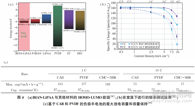 為了提高鋰電池的快速充電能力,Mishra等制備了一種含有Li+的復(fù)合聚合物黏結(jié)劑BIAN-LiPAA,以實(shí)現(xiàn)快速充電和更好的離子擴(kuò)散。BIAN-LiPAA黏結(jié)劑的較低未占據(jù)分子軌道的低能級(jí)減少了電解質(zhì)的分解,從而形成薄而離子導(dǎo)通的SEI。如圖4(a),該復(fù)合黏結(jié)劑具有較低的電荷轉(zhuǎn)移電阻和較低的鋰插入活化能,顯著提高了Li+在石墨中的擴(kuò)散。