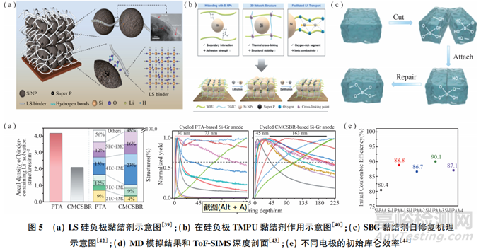 雖然增強(qiáng)聚合物黏結(jié)劑的機(jī)械性能被認(rèn)為是提高Si負(fù)極SEI穩(wěn)定性的有效手段,但對(duì)黏結(jié)劑化學(xué)性質(zhì)對(duì)SEI的影響機(jī)制尚不明確。Jin等設(shè)計(jì)了一種能夠控制SEI層的化學(xué)成分和空間分布的兩性離子黏結(jié)劑(PTA),闡明了兩性離子黏結(jié)劑對(duì)負(fù)極-電解質(zhì)界面溶劑化構(gòu)型和穩(wěn)定性的影響機(jī)制。陽離子和陰離子在分子水平上共存,兩性離子形成的帶電微環(huán)境改變了Si負(fù)極的溶劑化環(huán)境,Li+與溶劑相互作用減弱。如圖5(d)所示,在這種黏結(jié)劑調(diào)節(jié)的溶劑化環(huán)境中,當(dāng)黏結(jié)劑/陰離子參與SEI形成時(shí),電解質(zhì)的還原被顯著抑制,有助于在Si負(fù)極上形成薄而強(qiáng)韌的SEI。