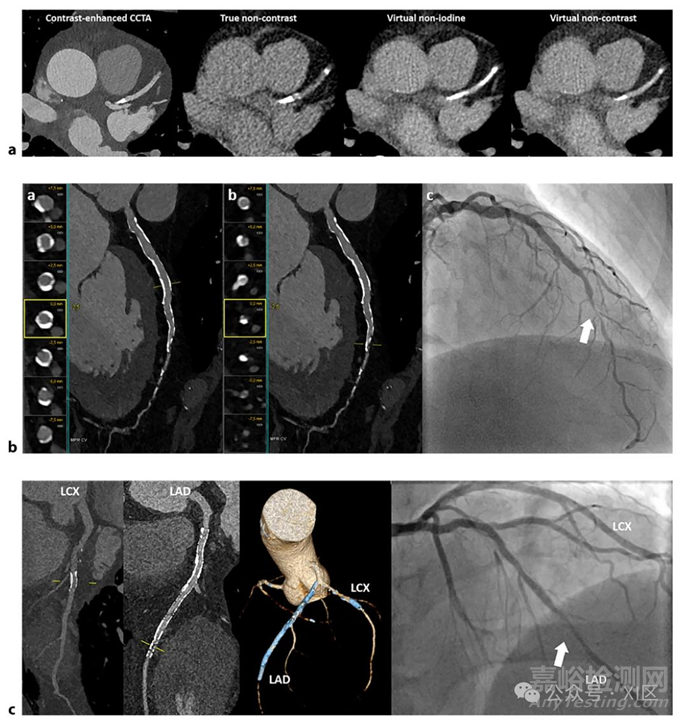 使用PCD-CT進(jìn)行的冠狀動(dòng)脈疾病高級(jí)評(píng)估。a 使用PCD-CT在增強(qiáng)、真實(shí)平掃、虛擬去碘和虛擬平掃圖像上進(jìn)行冠狀動(dòng)脈鈣化評(píng)分。與真實(shí)平掃圖像相比,左前降支(LAD)動(dòng)脈中的鈣化斑塊在虛擬去碘圖像上顯得更明顯,在虛擬平掃圖像上則不太明顯。b 對(duì)一名患有穩(wěn)定型心絞痛且存在多種危險(xiǎn)因素的66歲男性進(jìn)行冠狀動(dòng)脈超高分辨率成像。(a)LAD的多平面重建(MPR)圖像,顯示血管壁廣泛鈣化。MPR和橫斷面視圖顯示LAD近端和中段無(wú)明顯狹窄。(b)LAD的MPR圖像及橫斷面視圖顯示,LAD從中段到遠(yuǎn)端的過(guò)渡段管腔明顯變窄。(c)有創(chuàng)冠狀動(dòng)脈造影證實(shí)LAD中/遠(yuǎn)端存在明顯狹窄。c 使用超高分辨率PCD-CT進(jìn)行支架成像。對(duì)一名有典型胸痛癥狀的67歲男性患者采用超高分辨率模式的PCD-CT進(jìn)行冠狀動(dòng)脈CT血管造影。該患者有LAD和左旋支(LCX)動(dòng)脈支架置入史。多平面重建圖像顯示LCX支架通暢。然而,LAD支架內(nèi)遠(yuǎn)端存在再狹窄跡象。三維容積重建清晰顯示LAD和LCX中的支架。相應(yīng)的有創(chuàng)冠狀動(dòng)脈造影證實(shí)LAD存在支架內(nèi)再狹窄,LCX支架通暢。