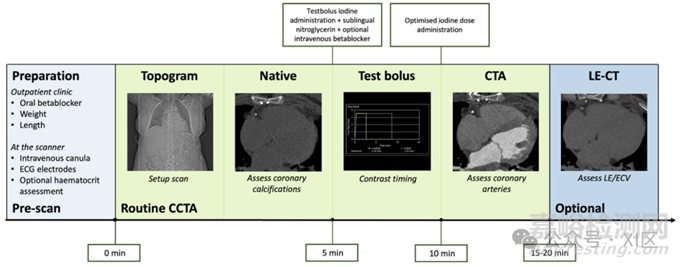 光子計(jì)數(shù)探測(cè)器CT成像方案,可一站式完成冠狀動(dòng)脈評(píng)估和延遲強(qiáng)化成像。常規(guī)冠狀動(dòng)脈CT血管造影(CCTA)方案的時(shí)長(zhǎng)約為10分鐘,額外的延遲強(qiáng)化(LE)CT采集會(huì)使總時(shí)長(zhǎng)延長(zhǎng)至約15 - 20分鐘。不同中心的采集時(shí)間可能有所差異。血細(xì)胞比容評(píng)估僅在注射對(duì)比劑5 - 10分鐘后進(jìn)行選擇性細(xì)胞外容積(ECV)評(píng)估時(shí)才是必要的。平掃是可選的,因?yàn)樗梢灾亟樘摂M去碘圖像。