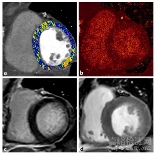 一名59歲近期被診斷為心肌梗死的女性的短軸位PCD-CT(圖a和圖b)和心血管磁共振圖像(圖c和圖d)。圖a展示了左心室的PCD-CT細(xì)胞外容積(ECV)圖,基底部下外側(cè)段ECV局灶性增加。圖b顯示了計(jì)算得到的碘圖,碘呈缺血性分布模式潴留,與心血管磁共振上的延遲釓增強(qiáng)區(qū)域(圖c)相對(duì)應(yīng)。圖d為(注射釓劑后的)短軸位電影圖像,其中基底部下外側(cè)段觀察到信號(hào)強(qiáng)度增加和節(jié)段性室壁運(yùn)動(dòng)異常,提示心肌梗死。