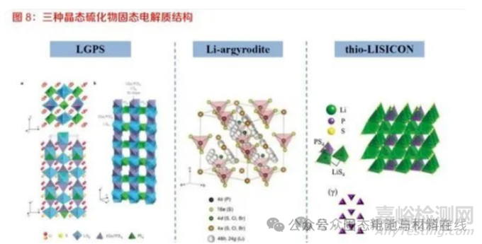 硫化物固態(tài)電解質通常以晶體結構劃分為玻璃態(tài)、玻璃陶瓷態(tài)和晶態(tài),其中,Li3.25Ge0.25P0.7S4 屬 于 thio-LISICON 型硫化物固態(tài)電解質,Li6PS5X(X=Cl, Br, I)屬于 Li-argyrodite 型固態(tài)電解質, Li10GeP2S12屬于 LGPS 型固態(tài)電解質。玻璃態(tài)硫化物固態(tài)電解質通過機械球磨或高溫熔融后快速冷卻的方法獲得,在 XRD 表征下沒有明 顯的峰。玻璃陶瓷類硫化物固態(tài)電解質通常為球磨后經過一步低溫燒結后獲得,屬于玻璃態(tài)和晶 態(tài)混合的亞穩(wěn)相,在 XRD 表征下有少量的峰。研究表明,玻璃態(tài)固態(tài)電解質主要由正硫代磷酸 鹽,焦磷酸鹽,偏硫代磷酸鹽,次硫代磷酸鹽四類微小晶體構成,其傳導離子的機理尚不十分明 確。晶態(tài)的硫化物固態(tài)電解質通常經過高能球磨后高溫燒結獲得,也有部分研究采用高能球磨、研磨 后燒結及液相法制備得到。晶態(tài)的硫化物固態(tài)電解質按晶體結構主要分為 thio-LISICON 型、Liargyrodite 型和 LGPS 型。這三種類型的電解質都有具體的晶體結構和鋰離子傳輸通道,其結構 組成和離子遷移機理都較為明確。