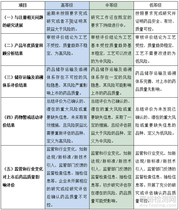 因以上五個(gè)評(píng)價(jià)維度中任何一個(gè)維度都對(duì)藥品的安全性、有效性、質(zhì)量可控性有直接影響,故選取任何一個(gè)維度出現(xiàn)高風(fēng)險(xiǎn)即定義為高風(fēng)險(xiǎn)。五個(gè)維度均為低風(fēng)險(xiǎn)才可定義為低風(fēng)險(xiǎn),其余為中風(fēng)險(xiǎn)。