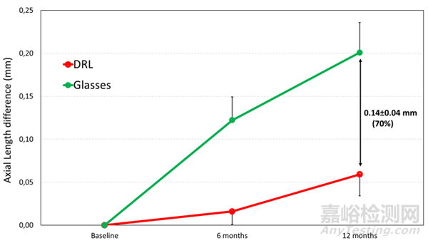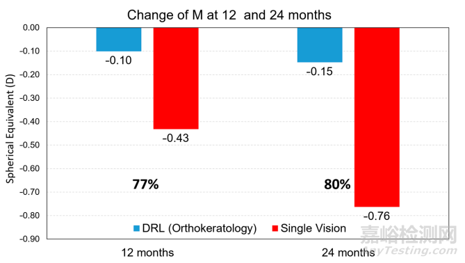 研究結(jié)果:25名患者組成了 DRL Night 組,23名在對照組(單光眼鏡組)。與單光眼鏡組相比,DRL Night 治療在6個月和12個月的鏡片佩戴后分別導致眼軸延長減少了86%和70%。