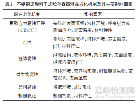 核電廠運行過程伴隨著大量乏燃料的產(chǎn)生,隨著我國核電裝機容量的持續(xù)提升和卸載乏燃料數(shù)量的快速增加,乏燃料的中間貯存和處理問題引起了廣泛關(guān)注。乏燃料干式貯存技術(shù)具有非能動余熱排出、安全性高、貯存規(guī)模便于擴展和廢物少量化等優(yōu)勢,逐漸成為世界主要核電國家的乏燃料中間貯存方案。乏燃料干式貯存容器是乏燃料干式貯存設(shè)施的重要組成部分,在輻照、溫度、濕度和腐蝕介質(zhì)等因素的影響下,乏燃料干式貯存容器不可避免地會發(fā)生老化降質(zhì)現(xiàn)象,不銹鋼乏燃料干式貯存容器常見的潛在老化機制及其主要影響因素如表1所示。這些老化機制造成材料損失和開裂等老化效應(yīng)。在充分識別老化效應(yīng)和老化機制的基礎(chǔ)上,開發(fā)合理可行的檢查大綱,及時探測和識別乏燃料干式貯存容器的潛在老化降質(zhì),并對所觀測到的性能劣化進行評估及糾正,對確保乏燃料干式貯存容器的結(jié)構(gòu)完整性和預(yù)期功能的實現(xiàn)具有重要作用。