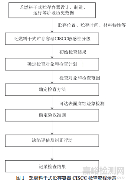 根據(jù)國內(nèi)外核電廠實踐經(jīng)驗反饋,乏燃料干式貯存技術(shù)主要將氣體作為冷卻劑,乏燃料產(chǎn)生的衰變熱通過空氣對流帶出,因此在制定檢查策略時,首先應(yīng)注意定期檢查,以確保乏燃料干式貯存設(shè)施有效通風(fēng),即對乏燃料干式貯存容器進、出風(fēng)口進行定期檢查,以避免進、出風(fēng)口阻塞等情況發(fā)生。更重要的是應(yīng)制定有效的定期檢查策略,以及時探測乏燃料干式貯存容器表面的銹蝕、開裂等老化跡象。美國電力研究院(EPRI)相關(guān)報告提供了一種基于分級策略對乏燃料干式貯存設(shè)施中不銹鋼乏燃料干式貯存容器的CISCC相關(guān)老化進行檢查的方法和思路。第一步是基于貯存位置、貯存時間、材料特性和總衰變熱載荷等可能影響乏燃料干式貯存容器CISCC敏感性的因素,對所有貯存容器敏感性進行排序,在敏感性排序過程中充分考慮貯存容器在設(shè)計、制造和運行階段的歷史信息和數(shù)據(jù)。第二步是檢查對象和檢查計劃的確定,相關(guān)技術(shù)報告指出,在干式貯存容器初始的20年貯存期內(nèi),其預(yù)期功能被認為不會受到明顯影響,可不進行相關(guān)檢查。在20年貯存期后,應(yīng)對典型干式貯存容器進行初始檢查,以探測可能由CISCC導(dǎo)致的老化降質(zhì)?;谫A存容器的初始檢查結(jié)果,對貯存容器進行分類,即A類(未腐蝕)、B類(腐蝕但未開裂)和C類(開裂)。針對每類貯存容器,依據(jù)其中每個貯存容器的CISCC敏感性分級和排序,劃分出可能被用于檢查的貯存容器,建立檢查試樣的數(shù)量及頻率確定原則,形成最終的檢查對象和檢查計劃。第三步是檢查方法的確定,根據(jù)貯存容器檢查試樣和檢查區(qū)域確定檢查方法,使用的檢查方法應(yīng)能對貯存容器可達表面的腐蝕跡象進行檢測。第四步是驗收準(zhǔn)則的確定,為采取后續(xù)糾正行動等提供支撐。第五步是缺陷評估及糾正行動,分析裂紋等缺陷穿壁擴展可能產(chǎn)生的后果,評估需要采取的糾正行動。第六步是檢查結(jié)果的記錄,應(yīng)至少對檢查的貯存容器信息,表面目視檢查形貌,檢查中識別到腐蝕跡象的位置、范圍和尺寸,附近區(qū)域的氯化物面密度、濕度、溫度等環(huán)境因素,現(xiàn)場圖片及檢查結(jié)論等進行記錄。乏燃料干式貯存容器CISCC檢查流程如圖1所示。