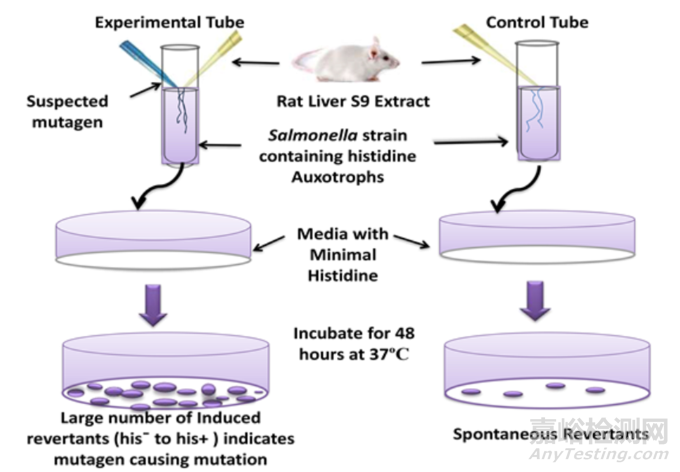 該試驗采用鼠傷寒沙門氏菌組氨酸營養(yǎng)缺陷型菌株或大腸桿菌色氨酸缺陷型菌株,這些突變的菌株自身不能合成組氨酸或色氨酸,必須依賴外源性組氨酸/色氨酸才能生長,而在無組氨酸/色氨酸的選擇性培養(yǎng)基上不能存活。
