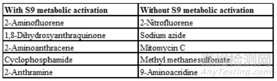 表4.有和沒有 S9 代謝激活的陽性對照[2]