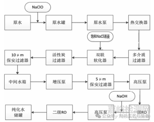 純化水系統(tǒng)由制備系統(tǒng)和貯存分配系統(tǒng)組成,其中制備系統(tǒng)包括預(yù)處理單元( 多介質(zhì)過(guò)濾器、雙聯(lián)軟化過(guò)濾器、活性炭過(guò)濾器) 和純化單元( 一級(jí)反滲透+二級(jí)反滲透) ,貯存分配系統(tǒng)包括儲(chǔ)罐及一系列循環(huán)管路。其制備工藝如圖 1 所示。