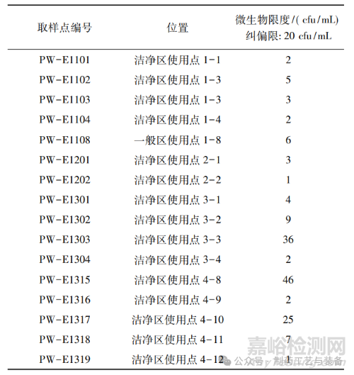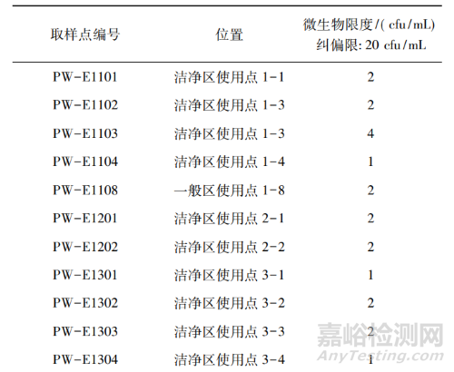 上述系統(tǒng)從運(yùn)行至今已有 5 年以上時(shí)間,期間持續(xù)進(jìn)行水質(zhì)質(zhì)量監(jiān)控,均持續(xù)穩(wěn)定并符合要求。對(duì)于微生物限度,除合格標(biāo)準(zhǔn)(不得過(guò) 100 cfu /mL) 外,還設(shè)置了糾偏限(20 cfu /mL) 。該系統(tǒng)發(fā)生過(guò)一次純化水個(gè)別取樣點(diǎn)水樣微生物限度超糾偏限的情況。