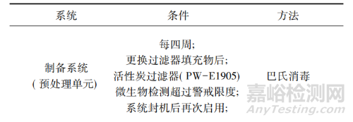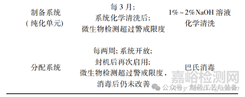 表2 純化水系統(tǒng)消毒與化學(xué)清洗方法