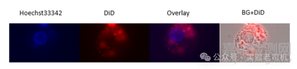 Hoechst 33342熒光染料主要染色細胞核(Hoechst33342),而DiD與外泌體共孵育后,主要染色外泌體(DiD)。帶紅色熒光標記的外泌體與細胞共孵育后,可能會進入細胞質(zhì)(Overlay),主要現(xiàn)象在BG+DiD組中體現(xiàn)。若設(shè)置時間拍攝可通過帶熒光標記外泌體在胞質(zhì)的滯留的量判斷外泌體被細胞攝取的一個相對動態(tài)變化。