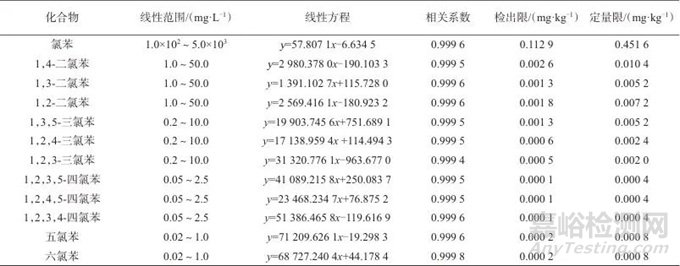 Tab. 1 Linear range,linear equation,correlation coefficient,detection limit and quantitation limit of 12 chlorobenzenes