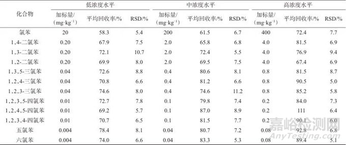 由表1可知,12種氯苯類化合物在各自質(zhì)量濃度范圍內(nèi)與色譜峰面積線性關(guān)系良好,相關(guān)系數(shù)均大于0.999,檢出限為0.000 1~0.112 9 mg/kg,定量限為0.000 4~0.451 6 mg/kg。