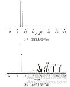 圖5 空白及加標(biāo)土壤樣品色譜圖