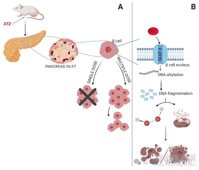 STZ毒性:STZ通過葡萄糖轉(zhuǎn)運體GLUT2進入β細胞,釋放一氧化氮(NO)和自由基,引起DNA烷基化損傷,最終導致β細胞凋亡。