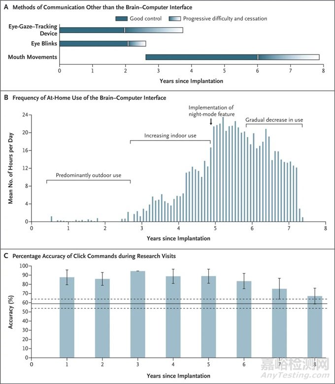 患者在植入設(shè)備7個月后開始在家中獨立使用腦機接口進行交流。最初,該系統(tǒng)主要用于戶外環(huán)境,以彌補眼球注視跟蹤設(shè)備的不足。植入約2.5年后,由于進行性動眼肌損傷(圖1A),患者逐漸減少使用眼球注視跟蹤裝置,轉(zhuǎn)而更多地在室內(nèi)使用腦機接口與家人和護理人員溝通(圖1B)。到2019年秋季,她完全停止使用眼球注視跟蹤裝置。