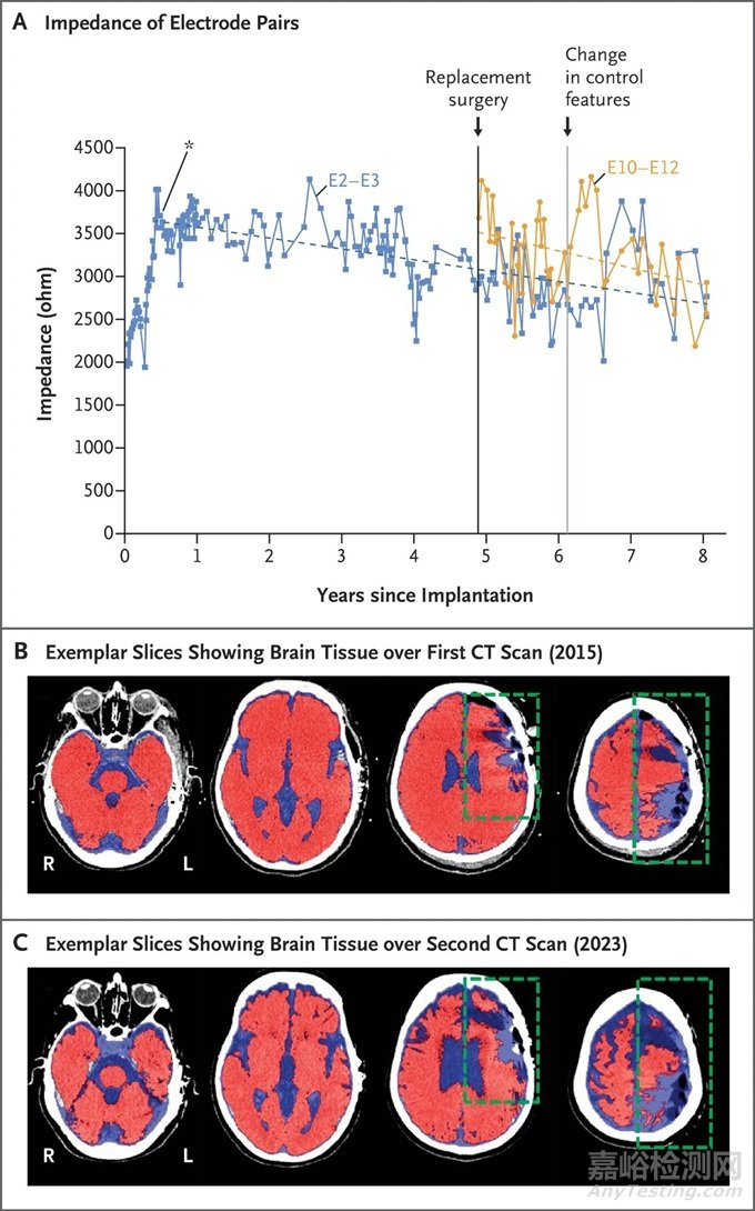 然而,植入近6年后,患者使用腦機接口的頻率開始下降。研究訪問期間的評估顯示,這種下降與點擊命令準確性的降低一致(圖1C)。此外,患者嘴角的殘余運動逐漸變得不一致且難以解釋(圖1A),導致護理人員越來越難以判斷她的呼叫是否出于有意。2022年10月,系統(tǒng)停止夜間使用,到2023年3月,腦機接口完全停用。此后幾個月內(nèi),患者完全喪失了嘴角運動能力(圖1A),進入完全閉鎖狀態(tài)。