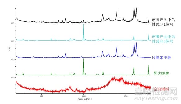 (3)如圖所示,通過拉曼光譜無損的測試市售產品,通過拉曼成像結合多次單點測試,獲取了兩種活性成分的拉曼信號,并通過與兩種原料藥參照信號對比可以發(fā)現,市售產品的活性成分1信號排除空白輔料和阿達帕林的信號后,與過氧苯甲酰的拉曼信號基本一致,市售產品的活性成分2信號與阿達帕林的拉曼信號基本一致。說明通過拉曼可以無損、快速對于低含量復方半固體制劑中活性成分進行晶型鑒別。