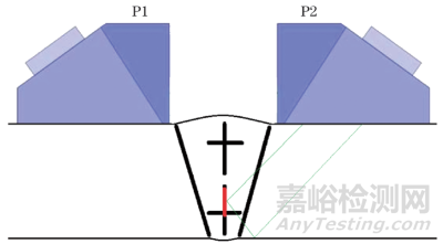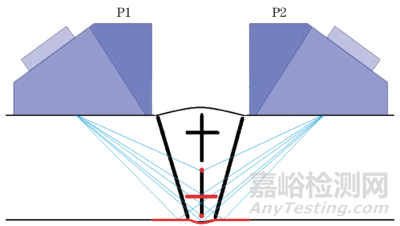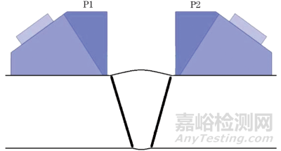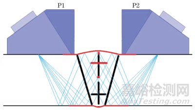 對置陣列數(shù)據(jù)采集模型如右圖所示,兩個陣列探頭布置在被檢測焊縫的兩側(cè),焊縫左側(cè)陣列探頭P1(陣元數(shù)目為n),焊縫右側(cè)陣列探頭P2(陣元數(shù)目為n)。數(shù)據(jù)采集分為以下幾個過程:
