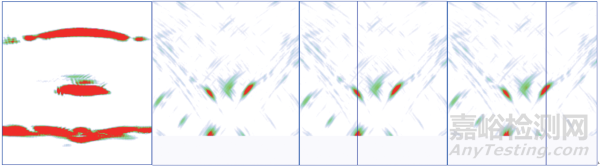 對P1采集的FMC數(shù)據(jù)采用TT-T[L]模態(tài)重構(gòu),焊縫內(nèi)部垂向分布缺陷的左反射面。