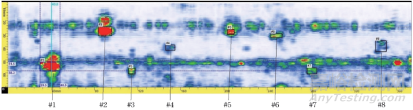 采用PAUT技術(shù)對焊接缺陷試塊進(jìn)行連續(xù)掃查的D掃描檢測結(jié)果如圖7所示。對照實際缺陷信息,8個焊接缺陷勉強能夠分辨,分別顯示在了1~3倍工件厚度范圍內(nèi),成像結(jié)果對于各缺陷深度信息的表達(dá)較抽象,且#4層間未熔合缺陷反射當(dāng)量低、存在漏檢風(fēng)險。