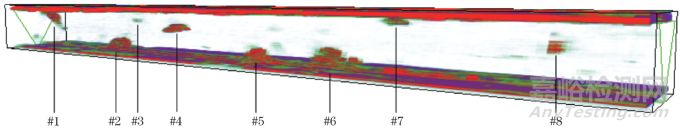采用對置陣列多模態(tài)全聚焦對焊接缺陷試塊進(jìn)行連續(xù)掃查的3D掃描檢測結(jié)果如圖8所示。無需對照實際缺陷信息,8個焊接缺陷均能輕松分辨,所有缺陷全部顯示在1倍工件厚度范圍內(nèi),成像結(jié)果對于各缺陷信息(長度、深度、水平位置)的表達(dá)立體直觀,可辨識度非常高。