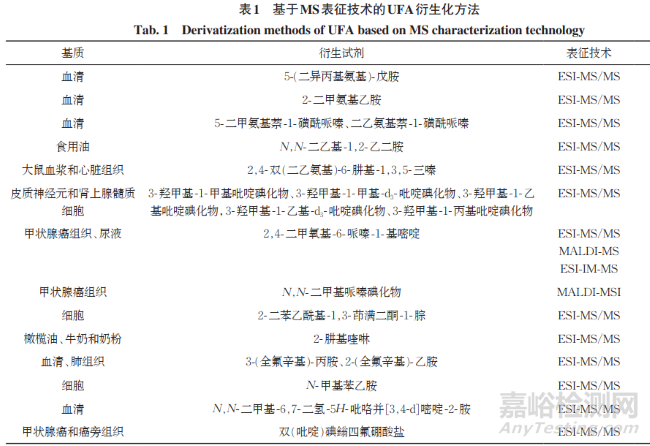 用于UFA檢測的各類質(zhì)譜技術,如色譜 [ 氣相色譜(GC)或液相色譜(LC)]- 質(zhì)譜聯(lián)用技術(GC-MS或LC-MS)、離子淌度(IM)質(zhì)譜聯(lián)用技術(IM-MS)、原位電離質(zhì)譜技術等,具有高靈敏度、高選擇性等諸多優(yōu)點,但直接用于UFA檢測時仍面臨諸多問題。如采用GC-MS直接檢測時,由于UFA揮發(fā)性差,其檢測靈敏度低;采用LC-MS直接檢測時,由于脂肪碳鏈長及官能團少,UFA 離子化效率較低;采用原位電離質(zhì)譜技術直接檢測時,生物樣本基質(zhì)干擾非常嚴重。為提高UFA檢測靈敏度,進而獲取復雜生物體系中微量或痕量UFA的分子質(zhì)量信息,目前多采用衍生化-質(zhì)譜法進行 UFA的測定。