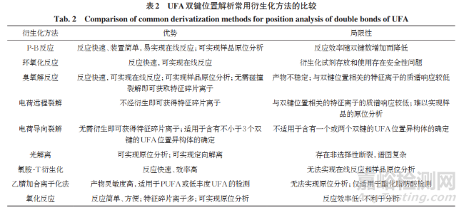 解析UFA雙鍵位置是目前的研究熱點之一,常用方法包括P-B反應、環(huán)氧化反應、臭氧解反應、電荷遠程裂解等,其他各類衍生化 - 質(zhì)譜法也在不斷涌現(xiàn)。這些質(zhì)譜表征方法在衍生化反應速率、裝置普