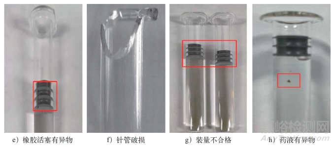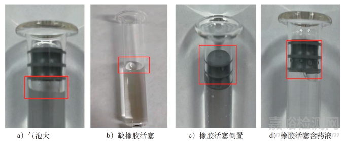 缺乏橡膠活塞是指在灌封過(guò)程中,橡膠活塞未能正確地填充進(jìn)注射器針管內(nèi)。橡膠活塞倒置則是指橡膠活塞在填充進(jìn)注射器針管后,其螺紋孔一側(cè)面向藥液端;在正常情況下,橡膠活塞的螺紋孔一側(cè)應(yīng)沿針管口朝外,以滿足后續(xù)旋入推桿的操作要求。