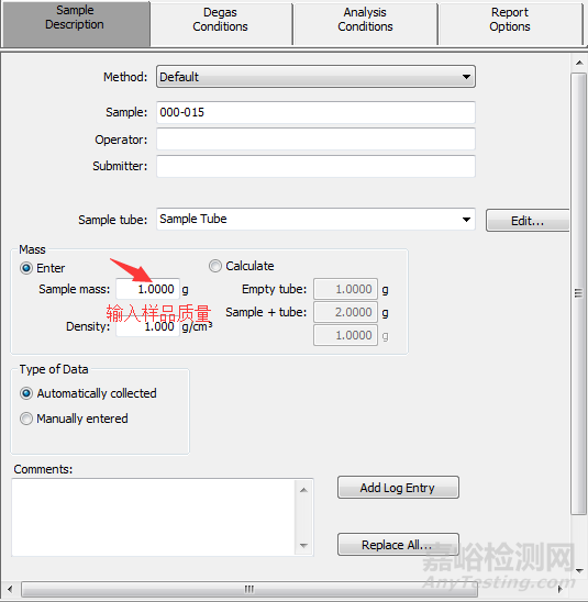 復(fù)稱量-重新稱量脫氣后的樣品+樣品的質(zhì)量,記為m3。(m3-m1)即為待測樣品的實際質(zhì)量。將這個質(zhì)量輸入到樣品分析文件中。并在樣品管中加入填充棒。