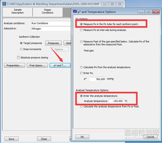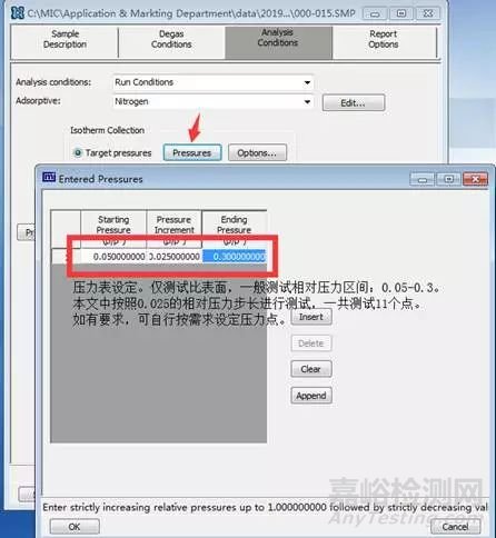 這是測試所得的等溫線的原始數(shù)據(jù)表格。第一列是相對壓力,與設(shè)定的壓力表相關(guān)。第二列是此相對壓力對應(yīng)的絕對壓力。第三列是此相對壓力下的吸附量。第四列是測試時間,與樣品表面達(dá)到動態(tài)平衡所需的時間相關(guān)。最后一列是P0測試所得的當(dāng)前的飽和壓力。