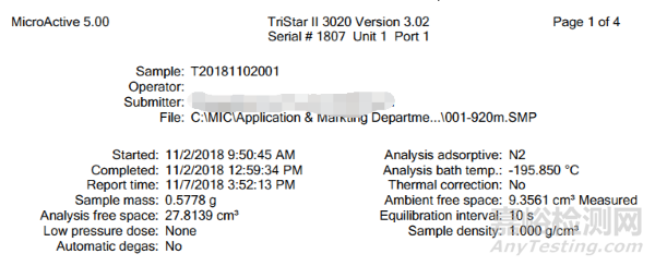 從測試結(jié)果表格1中我們可以看到,測試所用儀器為TriStar II 3020系列,測試開始時間為上午9點50分,中午12點59分測試結(jié)束。分析氣體為氮?dú)猓治鰷囟葹橐旱獪囟?195.85℃。樣品質(zhì)量為0.5778g,室溫下的自由空間體積為9.3561cm3,分析溫度下的自由空間體積為27.8139 cm3,平衡時間為10秒。