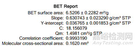 選擇3-5個點即可根據(jù)BET公式計算硬脂酸鎂的比表面積,得到BET報告。所選計算點需要使BET報告中的C值大于零,且相關(guān)系數(shù)至少在0.999或以上。滿足這兩個條件,即可得到有意義的比表面值6.5206 m2/g。