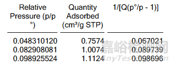 同時,我們能夠通過BET Report里面的表格報告得知所選擇計算點的相對壓力及吸附量信息。如下圖所示: